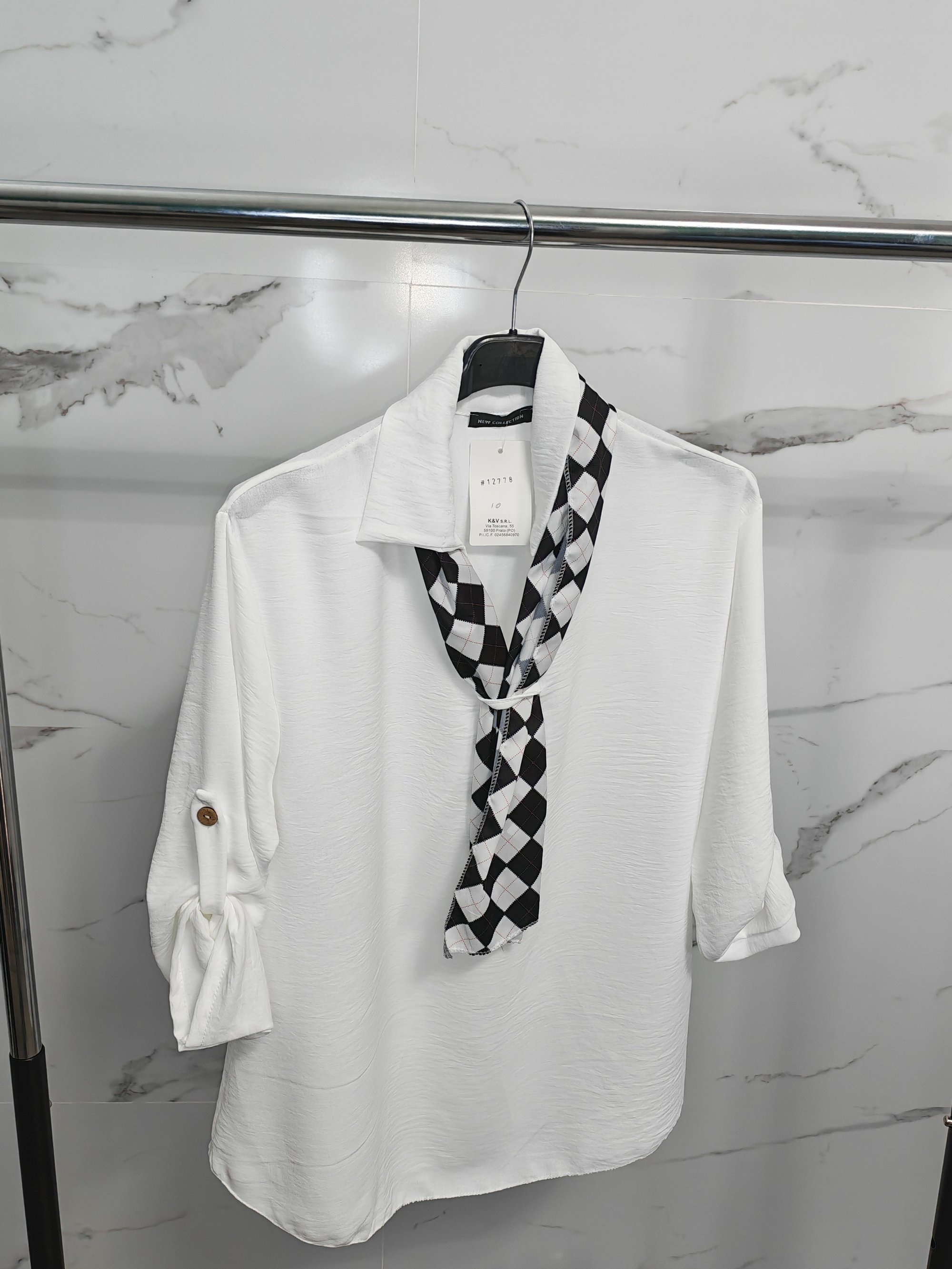 Il foulard a contrasto dona un tocco originale e raffinato, ideale per valorizzare anche l’outfit più semplice.