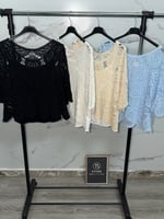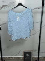 Blusa donna in pizzo macramé, dal design elegante e femminile. Realizzata in pizzo lavorato con motivo floreale, presenta scollo ampio che può essere indossato anche leggermente a spalla scoperta. Manica corta morbida e vestibilità fluida, ideale da portare sia su top che su abiti.Un capo raffinato ma versatile, perfetto per look casual chic o occasioni più eleganti.