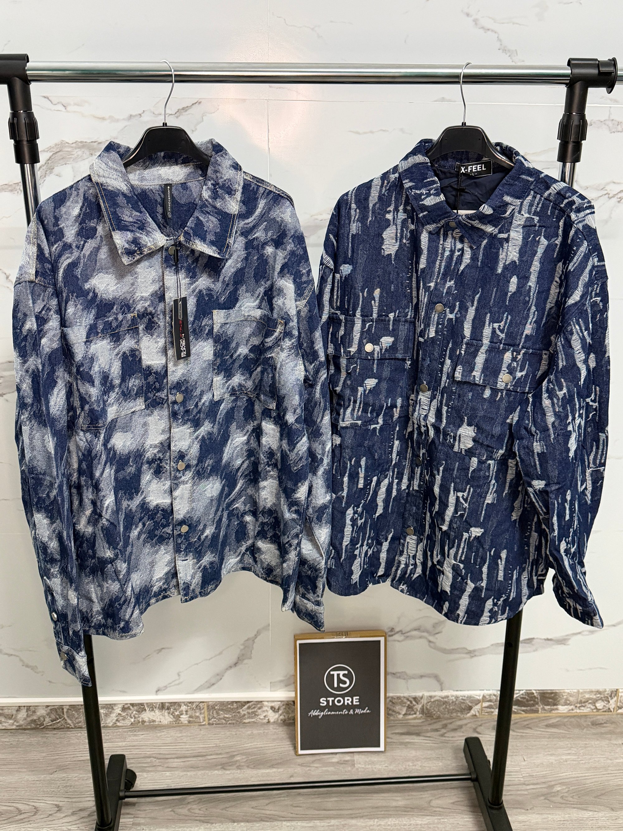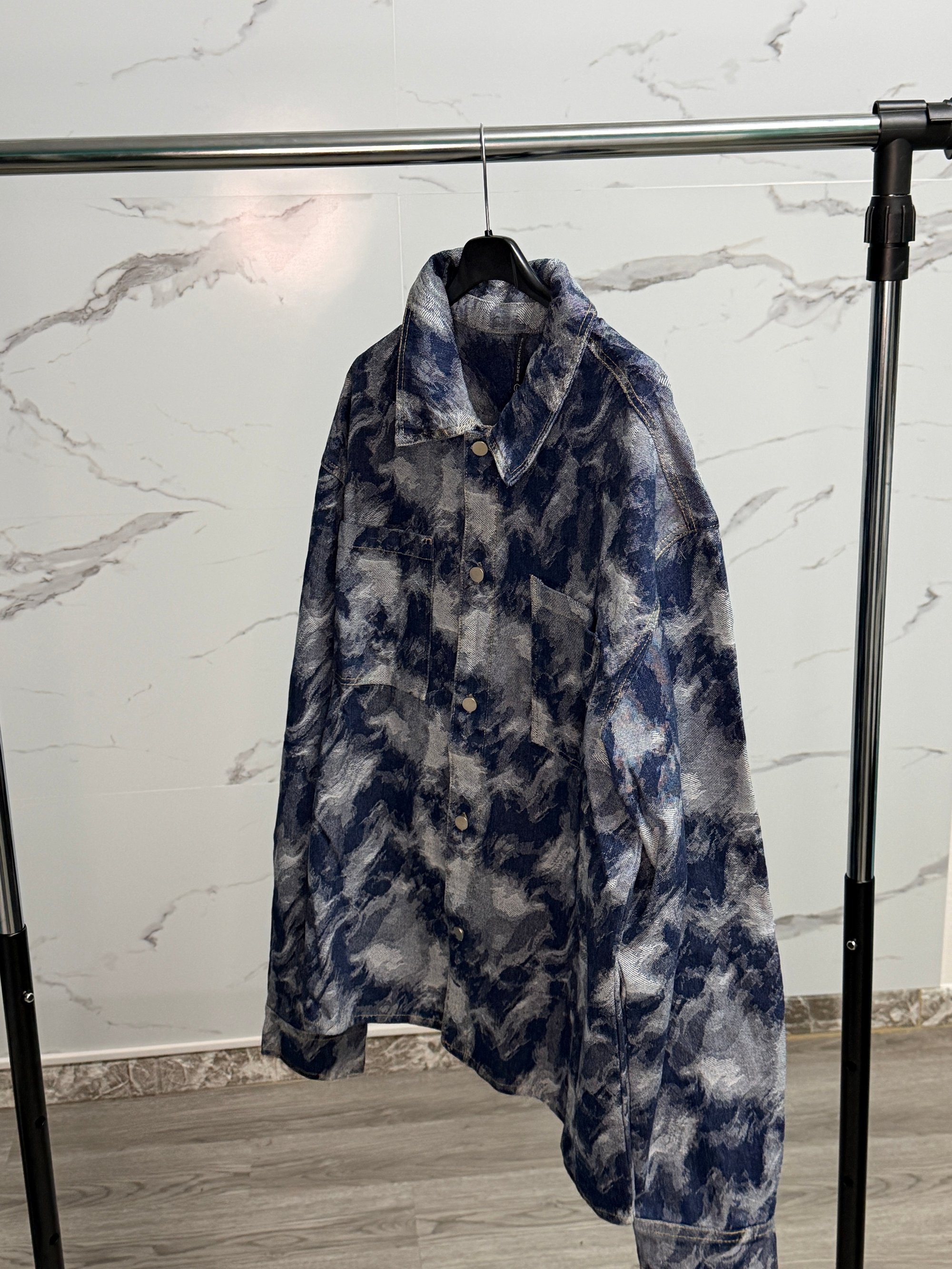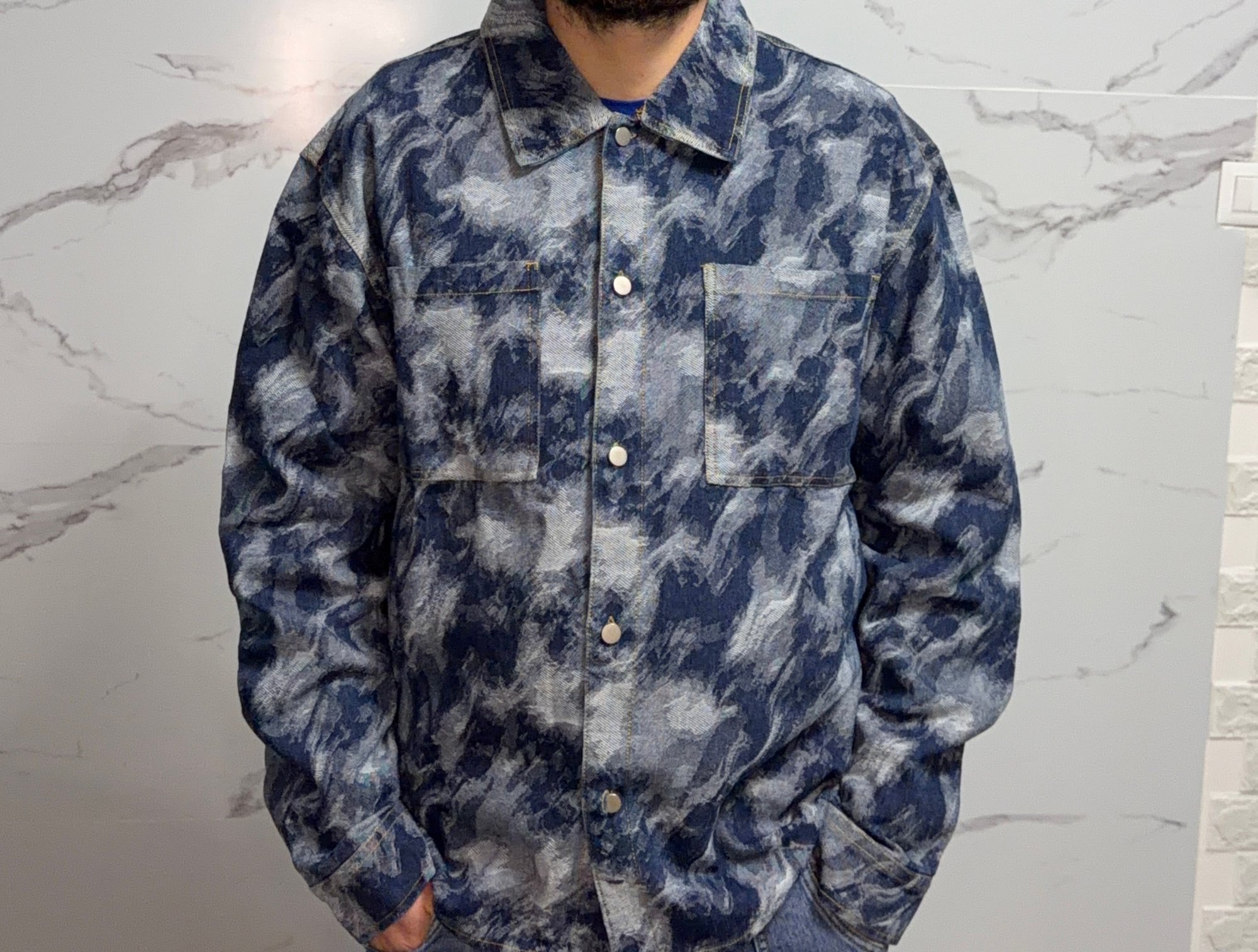 Giacca stile camicia in denim leggero con fantasia effetto marmorizzato.