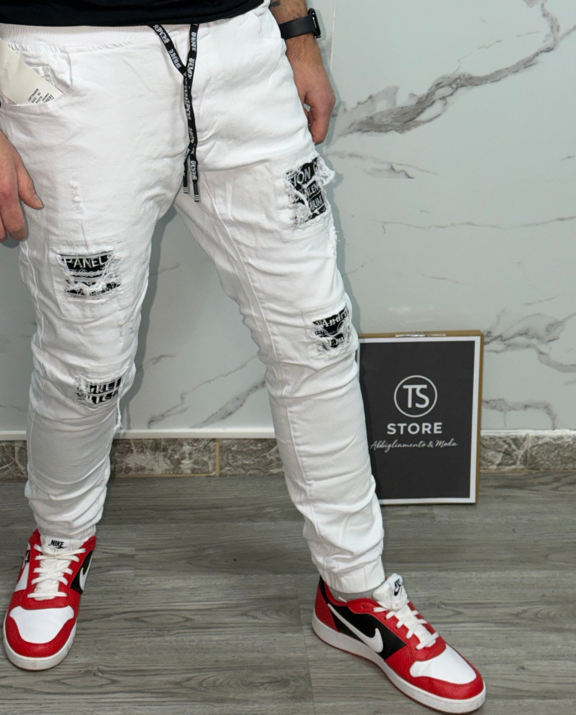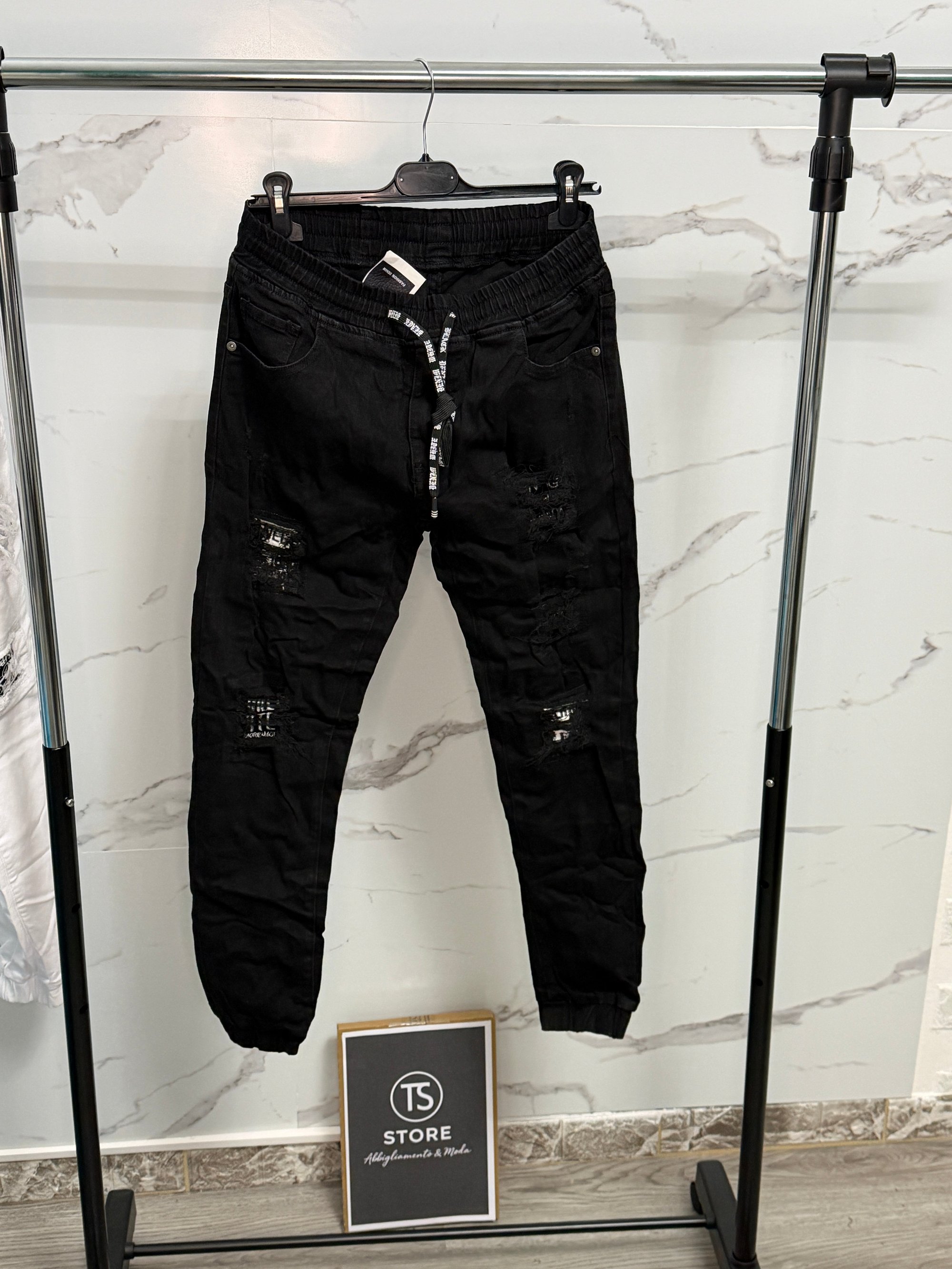 Vestibilità: Slim fitDettagli: Vita elasticizzata con laccio, effetto destroyed, fondo elasticizzato