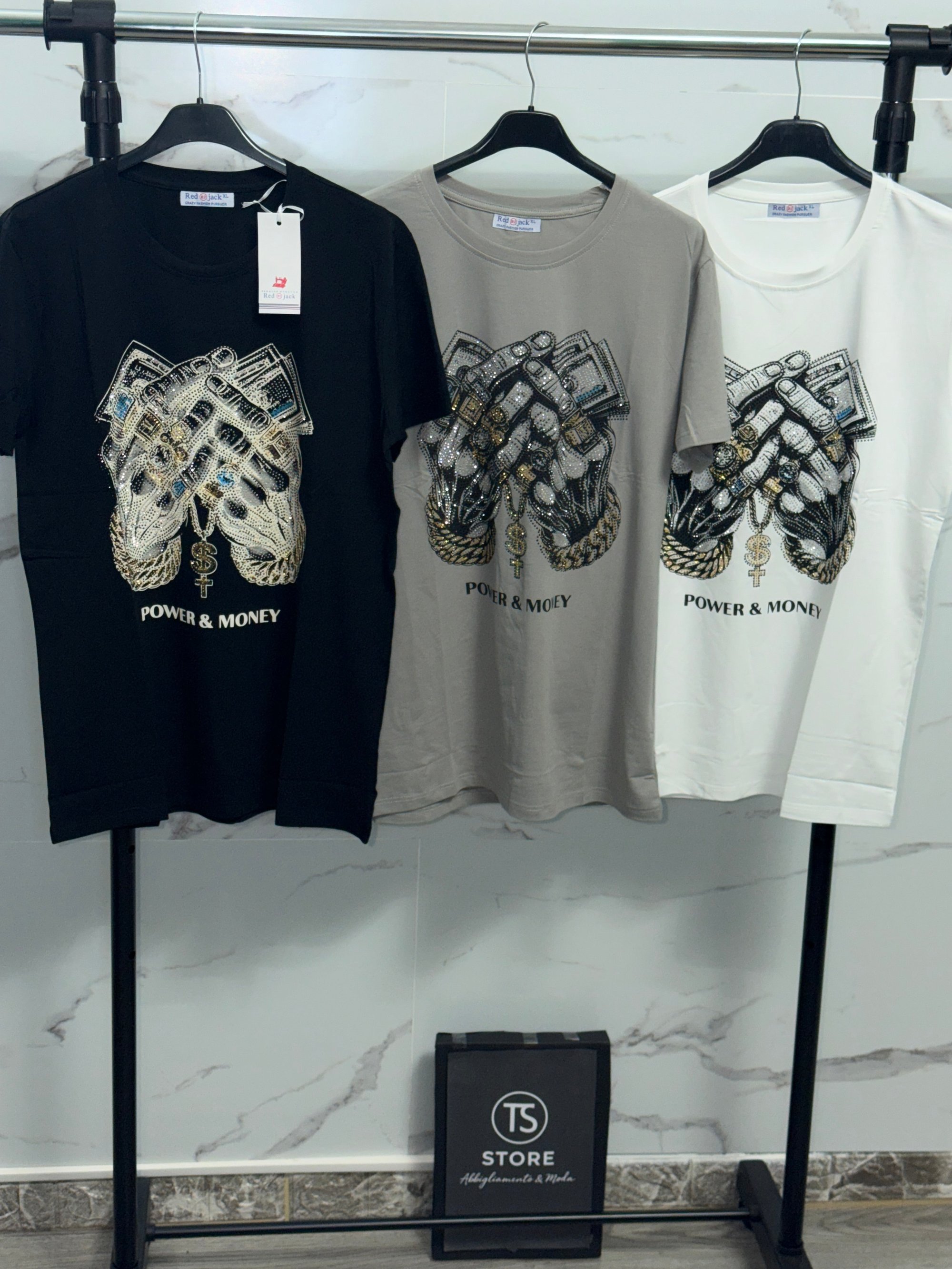 T-shirt luxury con grafica “Power & Money”, dettagli preziosi e pattern monogram. Stile deciso per chi vuole farsi notare.